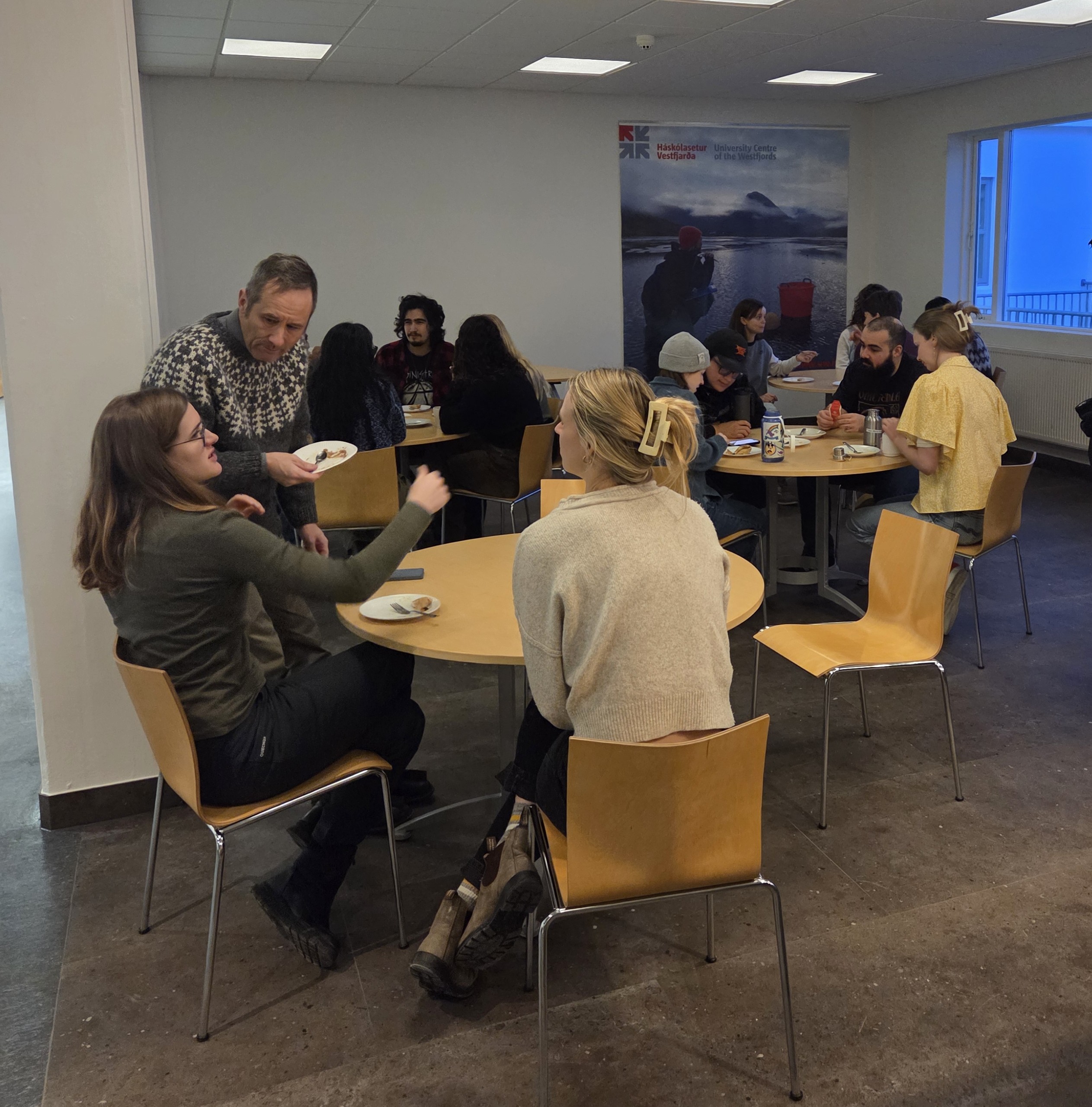 It’s an annual tradition for Gunna Sigga to host Sun Day coffee for the students and staff at UW. Along with baking pancakes, she also gives students the full story of Sun Day in Ísafjörður—and the history of the Icelandic pancake… which isn’t necessarily uniquely Icelandic, is it? Either way, everyone was thoroughly happy with the coffee spread.