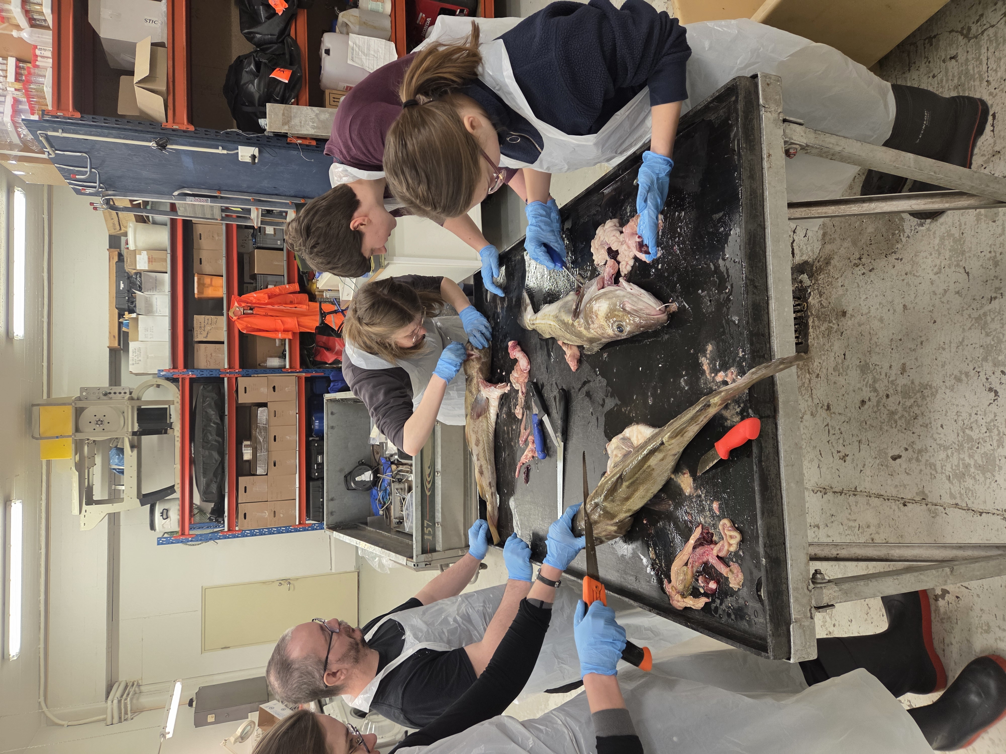 Under Dr. Kennedy’s guidance, the students dissected Atlantic cod and lumpfish to gain insight into how catches are sampled during MFRI’s scientific surveys. During these examinations, researchers identify the sex and maturity stage of each fish, and record stomach contents to understand feeding patterns. Students also removed otoliths—small ear bones located inside the skull—which are used to estimate a fish’s age and help build the data behind stock assessments. While this kind of work isn’t everyone’s favorite (dissecting can be a bit confronting for some), it offered a valuable, close-up look at the careful, methodical process behind the numbers that guide fisheries management.